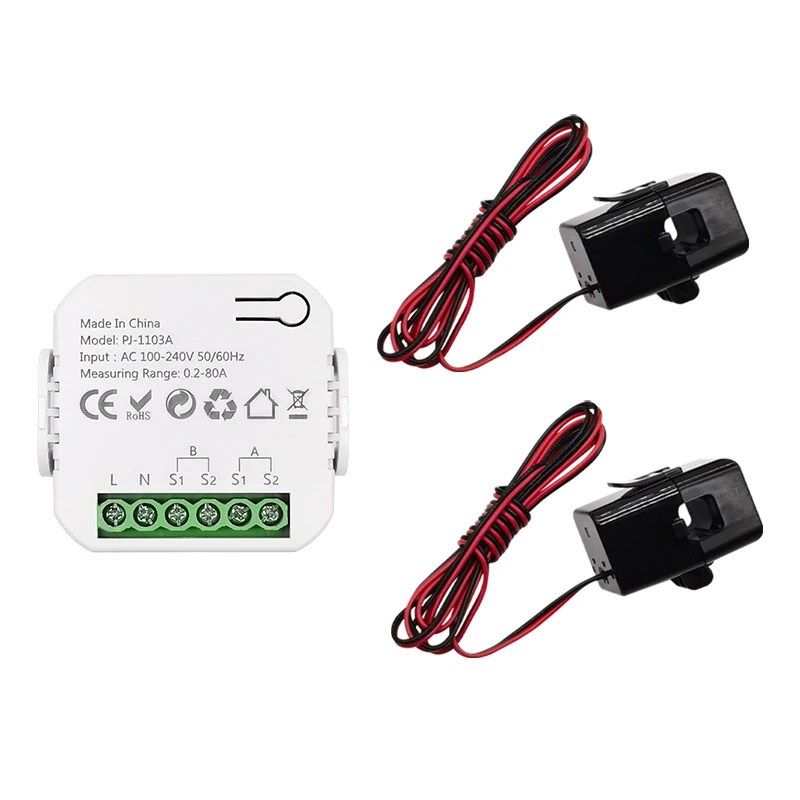 This Tuya Wifi power meter supports real-time monitoring of power consumption up to 80A via the free app (Tuya or Smart Life) and is compatible with Alexa and Google Home. (Note that this product is not compatible with Home Assistant.)